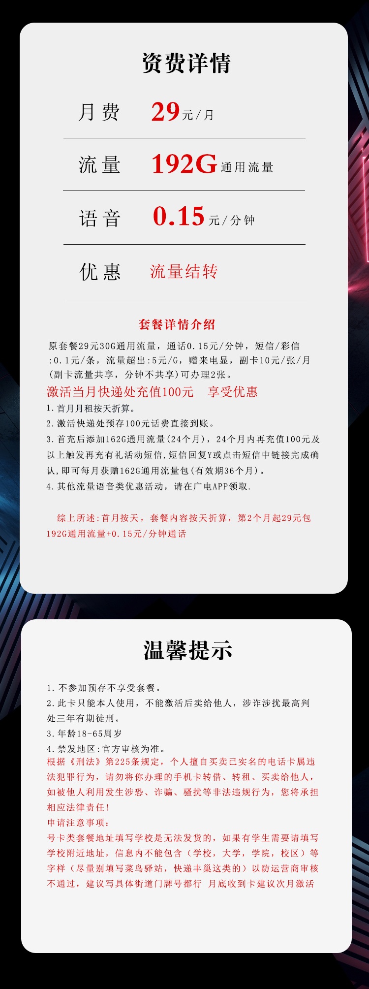 总结下:首月按天算,从第2个月起,29元就能稳拿192G通用流量+0.15元/分钟通话,这配置搁哪儿都算 “地板价”。